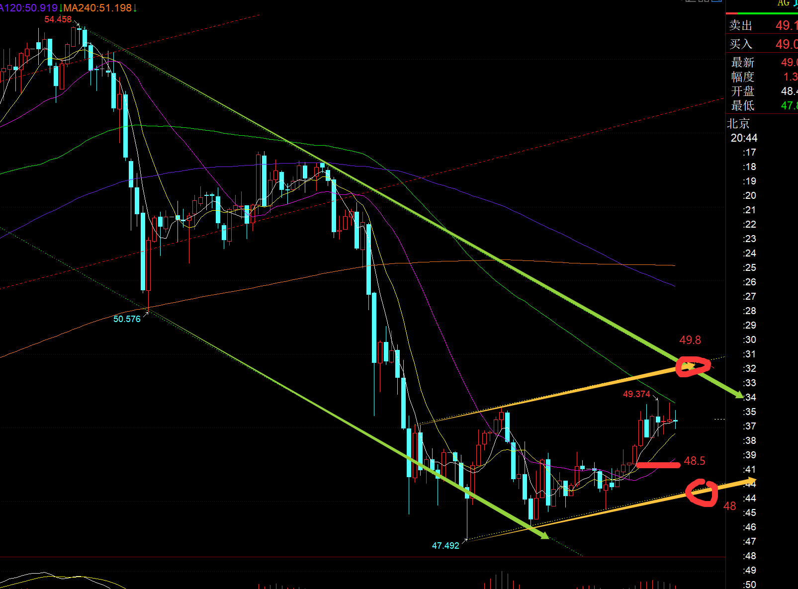 白银方面:它也是如此,处于底部整理雏形中,从通道角度看,上方关键压力49.8,下方关键支撑48,中轴48.5,震荡对待,然后等待什么时候突破信号; 若向上突破站上49.8,则短期底部也会出现,后市逐步向上走高;