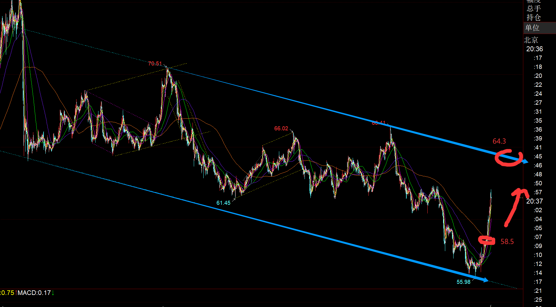 原油方面:这两日由于制裁,油价短线走高,当突破小时线年均线时,就意味着向上会有延续拉升动能; 从图中通道看,仍处于下行中,上轨64.3一线,今天亚欧盘持续走高,美盘前后出回踩动作可二次看涨,关注58.5之上找位置企稳看反弹;