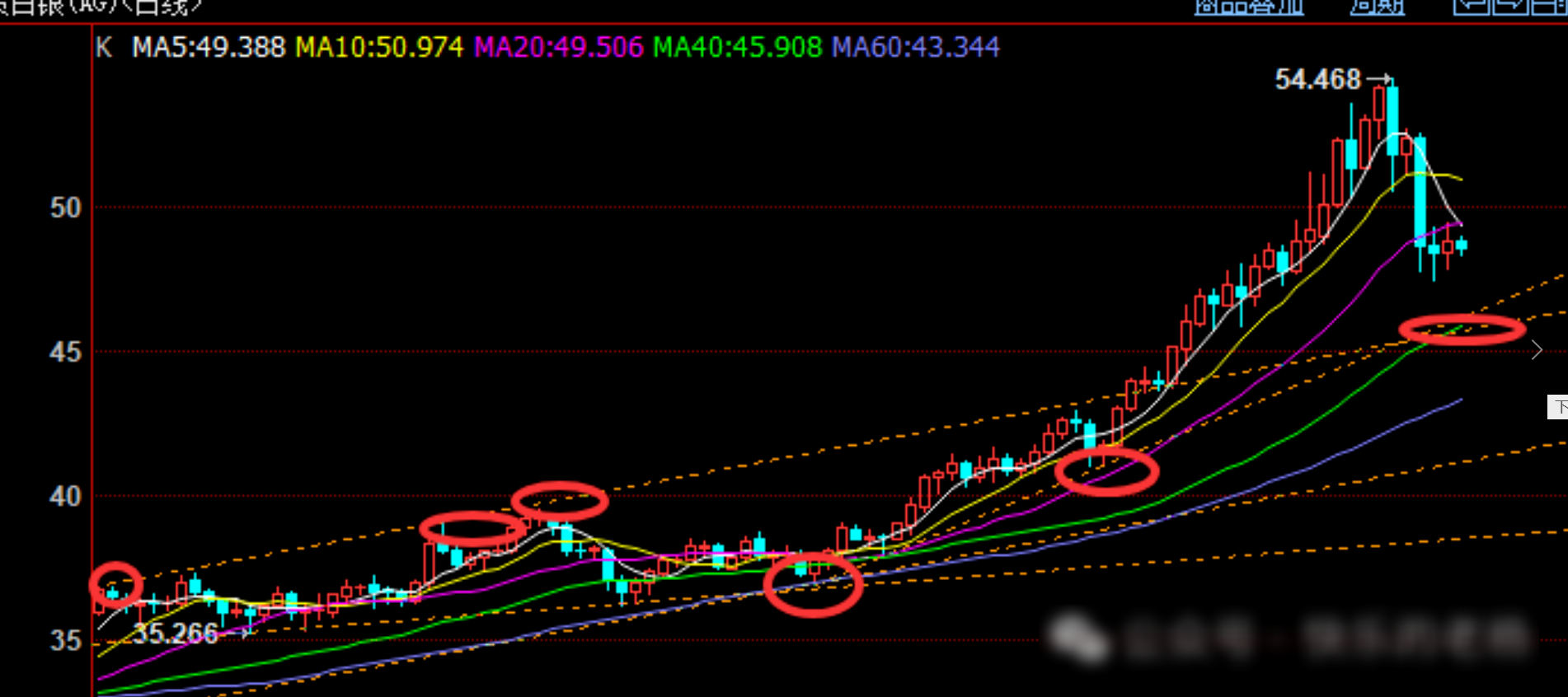 国际白银,49.5~50之下空头占据主动,站上去,则调整结束;下方重点支撑是46~45区域,坚守看调整后继续涨;这里一旦跌破,多头就遭到破坏了。