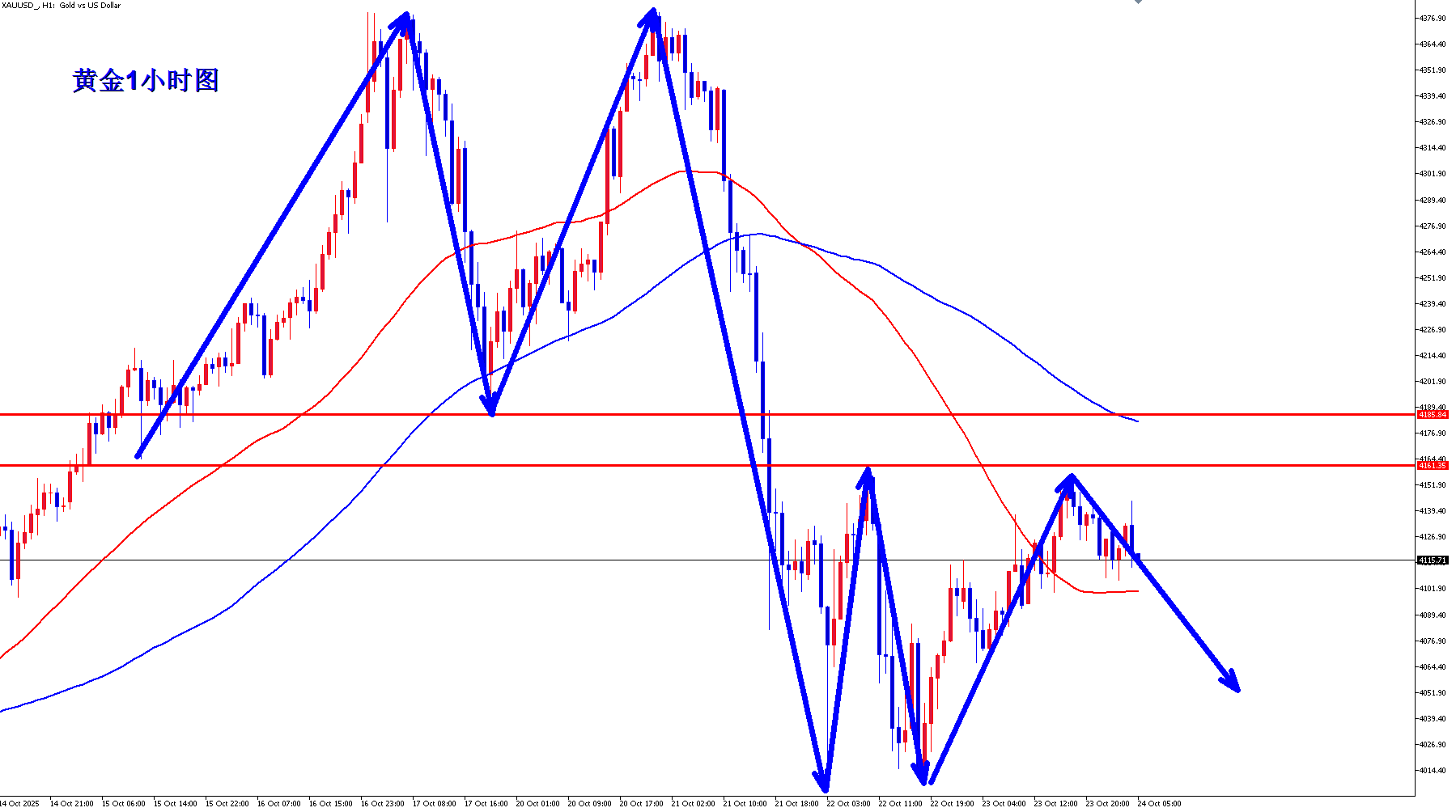 小时线中的辅助指标也基本遵循这一规律,短期看金价还会有向下试探的动作。