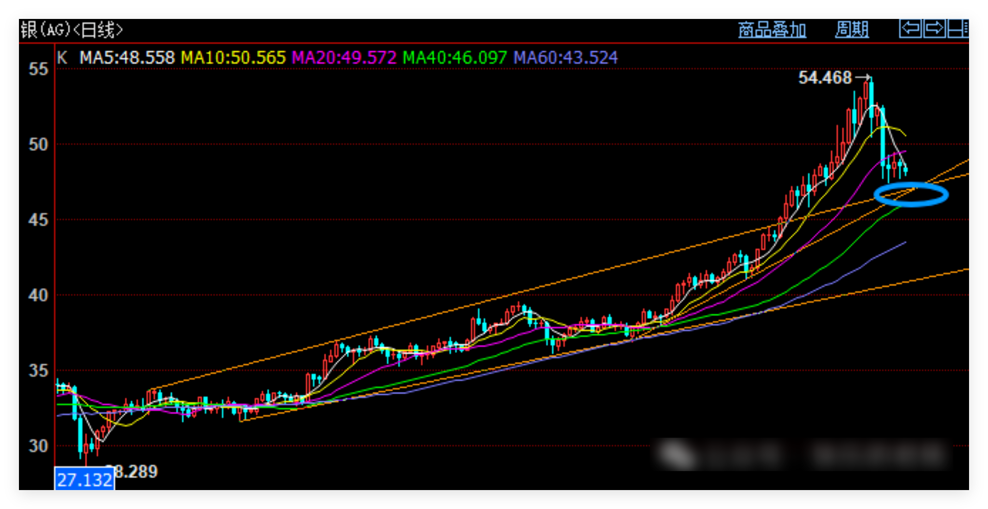 国际白银,重点压力下移,目前49.5~49之下空头占据主动,站上去,则调整结束;下方重点支撑是46~45区域,坚守看调整后继续涨;这里一旦跌破,多头就遭到破坏了。