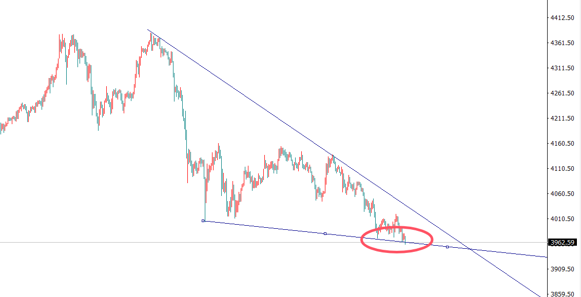早盘黄金在4020承压直接掉头,空单没有及时进场,现在行情回落,目前在3960一线形成明显支撑。这里下不去的话,那么行情将有望再次反弹,从而小时图形成下降楔形整理格局。