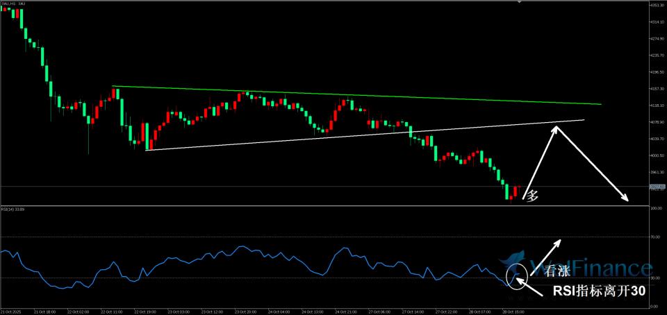 周二(10月28日美盘前金价低位震荡反弹,市场关注RSI突破30超卖阶段,市场进入美盘前的反弹行情,日内黄金大幅下跌,盘中跌幅超2%,触及三周低点。金价跌破关键技术位,且交易员因美中贸易紧张关系缓和,从避险资产转向风险资产。市场已明确跌破4100.43美元的枢纽位,以及4004.28美元和3944.43美元的两个摆动低点。随着这些支撑位被突破,黄金市场似乎准备测试下一个主要区域,即3846.50美元的50%回撤位和3782.23美元的50日均线之间的区间。