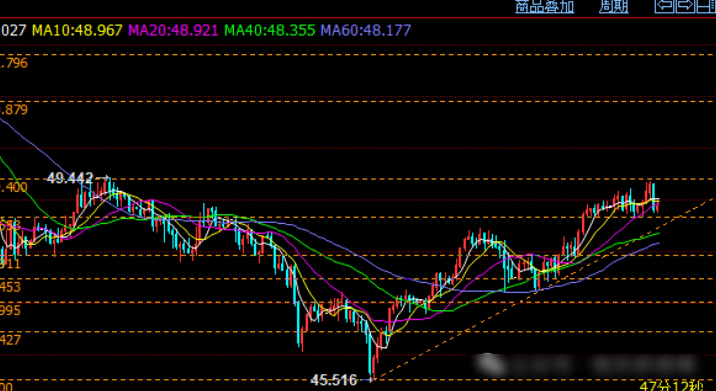 国际白银,白银中期支撑后于45.5附近止跌企稳并成功反弹后,日线三连阳,多头相对强势;今日周五,行情来到了49以上,短线需要注意回落。阻力49.5~50区域,支撑48.5区域上多头偏强,一旦下来行情则走弱,然后关注47.9和47.2~47区域。下方45.5~46区域不会破,否则,还要深跌。