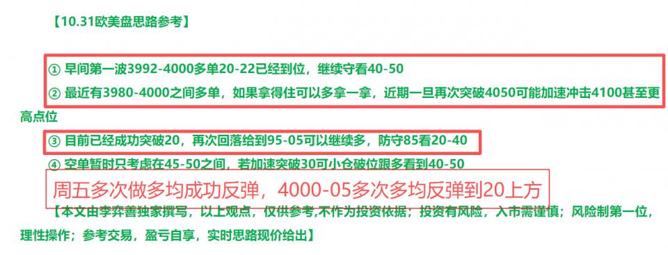 从今天开始美盘进入冬令时节奏,欧美开盘以及关键数据的公布均推迟一个小时,大家注意及时关注节奏变化。上周金价进入相对相对平稳阶段,虽然单日可能也有超百点波动,但是走势相对之前更加有迹可循。我们上周在3980-86下方多次做空均成功回落,同时在破位3980-86后及时调整节奏跟进多单,上周五在4000-05一线多次做多均成功反弹到4020上方。经历过一周的低位修复,多头已经接近调整尾声,随时将吹响进攻号角,开启新一轮攻势,近期主要操作更多还是以低位跟进多单为主。