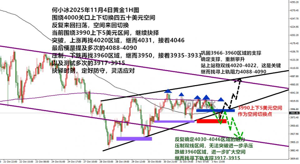 周二(11月4日),现货黄金美市盘前围绕3990美元窄幅整理。此前在3966.60—3962.60美元区域获得买盘支撑后,价格回到4000美元下方徘徊,小时K线呈现小实体震荡格局;更高处仍受制于高点4030.44与更前期高点4046.13美元所构成的上方密集阻力带。整体来看,黄金自10月20日创下4381美元历史高位以来进入有序回撤与盘整阶段,当前为重要方向抉择前的再平衡期。