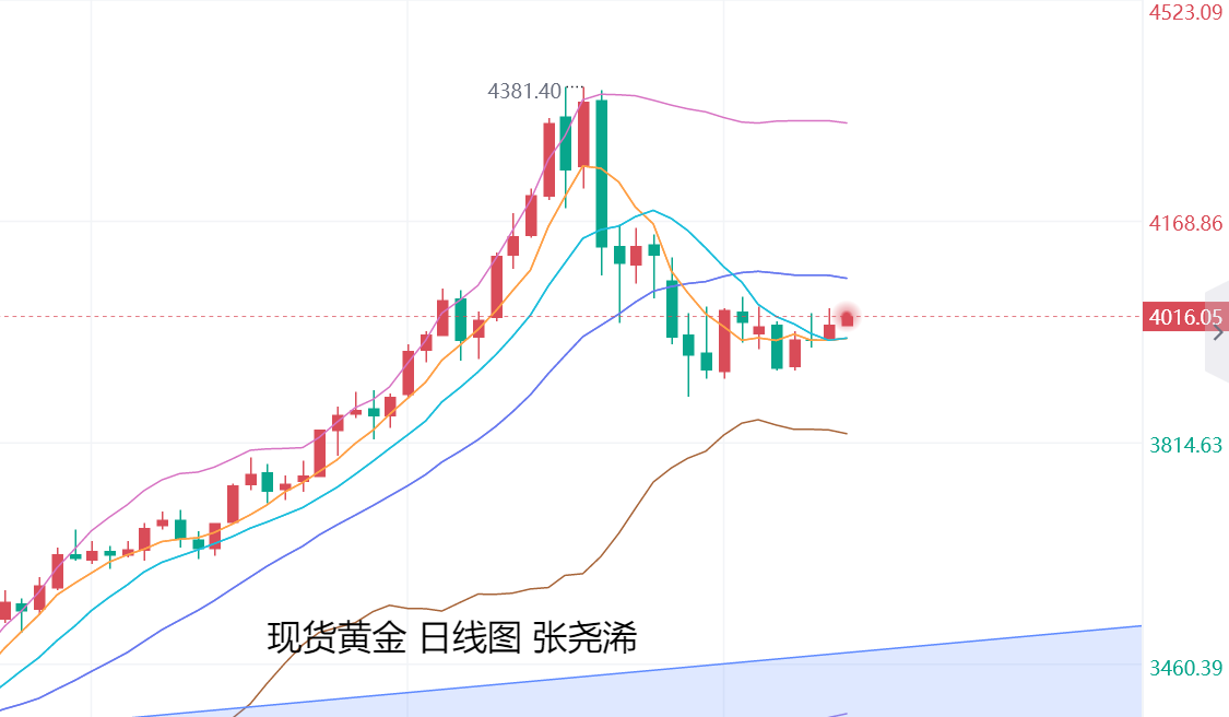 国际黄金周五(11月7日)震荡收涨,开盘价3980.27美元/盎司,最高价4014.27美元/盎司,最低价3965.65美元/盎司,收盘价3990.80美元/盎司。