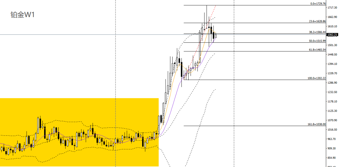 铂金上周收长阴柱,RSI自高位回落,波段不排除将延续回调。周五收十字阳线,日线RSI升至50附近,4小时再度守住1520-1530一带支撑,多单可继续持有,短线预计将重新上探1580-1600。