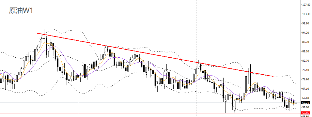 美原油上周小幅回落,承压于10周均线,波段大概率将维持震荡偏弱格局。周五收十字阳线,重新上探60大关,日线RSI升至50左右,短线方向仍不明朗,稳健者可暂时观望。