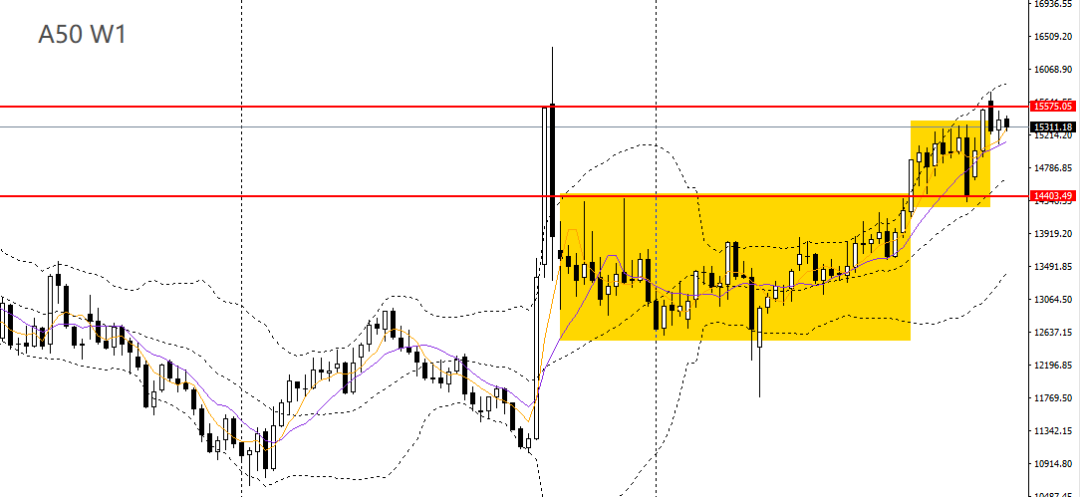 A50上周收长阳线,徘徊于5周均线附近,波段整体仍处于震荡偏强走势。周五收十字阴线,日线RSI位于50附近,4小时于15500一线遇阻回落,短线趋势再度转弱,后市有望重新回踩15000。