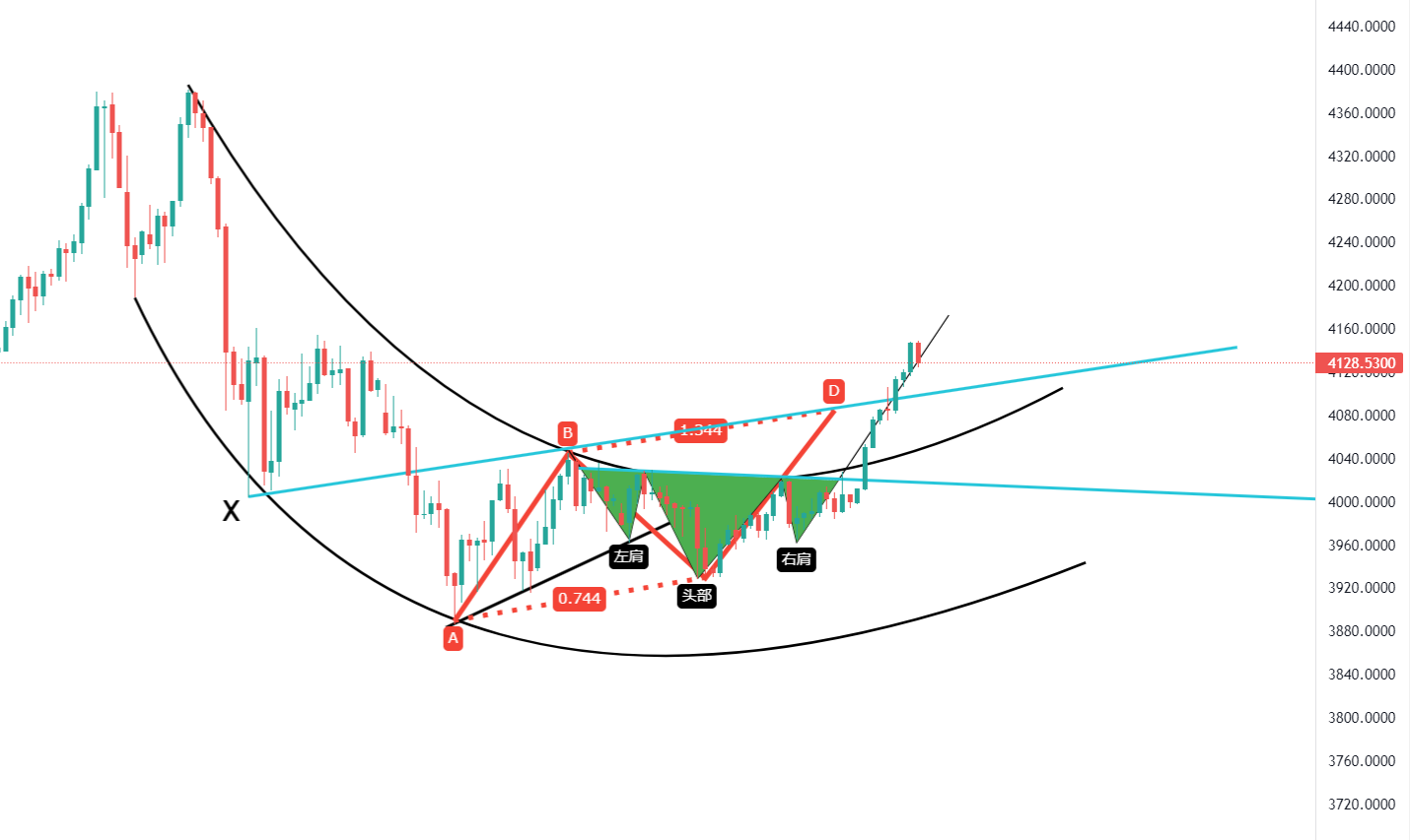 不仅如此,图中绿色的头肩底,也是当时的蓄力上涨风险,刚好AB双肩的位置都在3960,且还突破了颈线压力4000,反正就是连环套,让我没有直接获取黄金能够上去的信息,也没跟上这波列车,甚至中间还做了两次看跌交易被清算,只是没被套,还好,那你说现在全盘突破,我不承认它是反转也不现实。