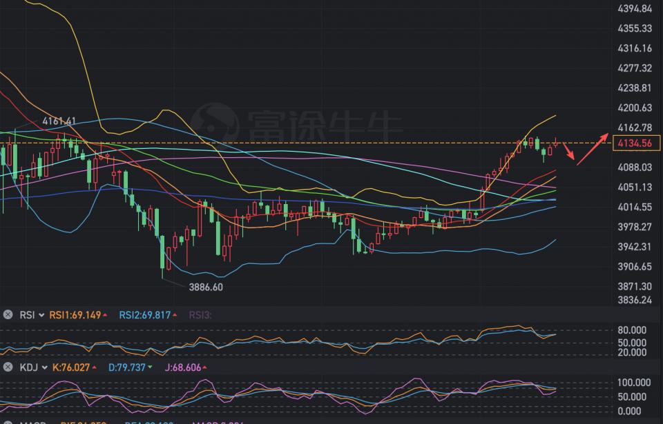 周二金价未能触及4150,其后的回落也符合我们预期(价格来到4100一线),紧接而来的触底反弹在今天(11月12日)延续,但仅触及4145后再次回落。从1小时线来看,MACD空头动能略有收敛,EMA/SMA20均线交织于4125-4130之间,布林带亦有收敛,表明短期内价格仍将遇阻4150。