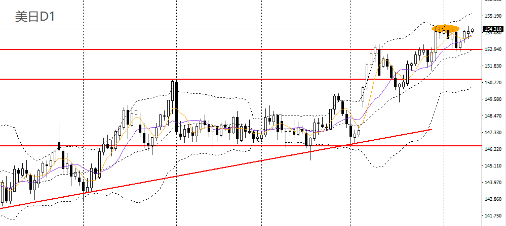 美日周二收十字星,再度逼近前高,154上方可延续低多思路,如升破154.40一线,后市可继续看多至154.80-155。