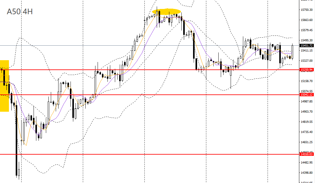 A50收长阴柱,完全收复周一涨幅,4小时回踩15200一线支撑企稳,短线趋势再度转多,上方继续关注15500附近阻力,如无法升破,多单可暂时离场,如进一步升破,可上看至15700。