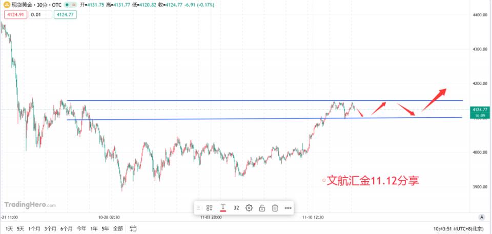 周三(11月12日)亚市早盘,现货黄金震荡微涨,目前交投于4135美元/盎司附近,守住了前几个交易日涨幅。金价周二上涨0.27%,收报4126.62美元/盎司,盘中最高触及4148.91美元,创下10月23日以来新高,美国政府停摆即将结束、经济数据恢复在即、以及美联储内部鹰派转鸽的明确信号,共同点燃了黄金市场的多头火焰。