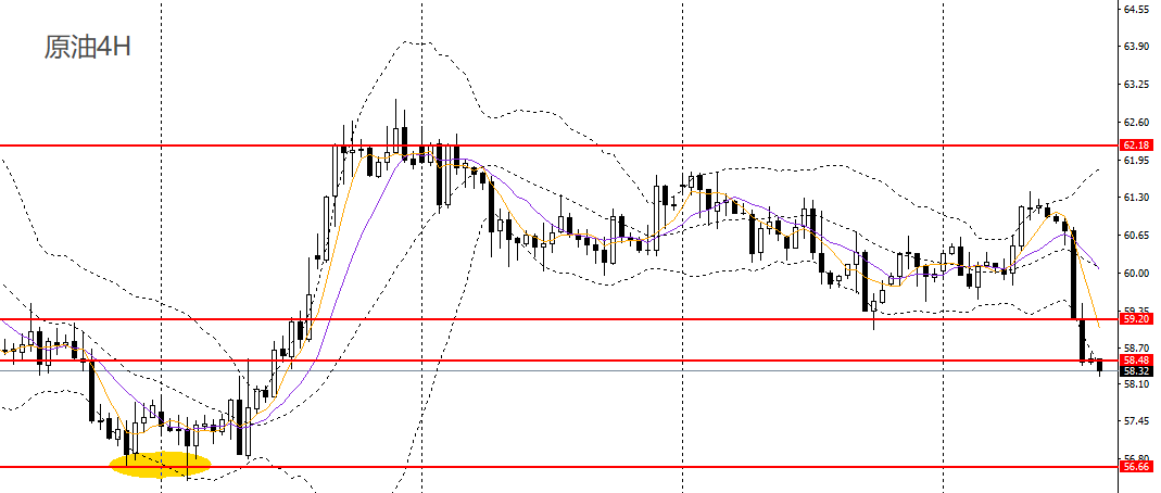 美原油周三重幅下挫,彻底下破60大关,日线RSI重新拐头下行,4小时打破半个月以来的震荡格局,如于59附近承压可进空,后市有望下探57-58一带。