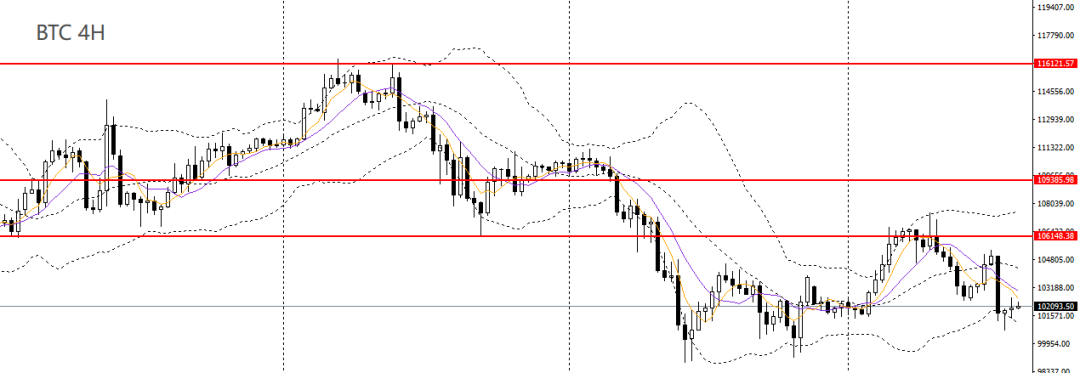 比特币继续震荡走低,承压于5日均线,106000附近仍面临强压,如无法升破,短线预计将延续震荡格局,或重新回踩100000关口。