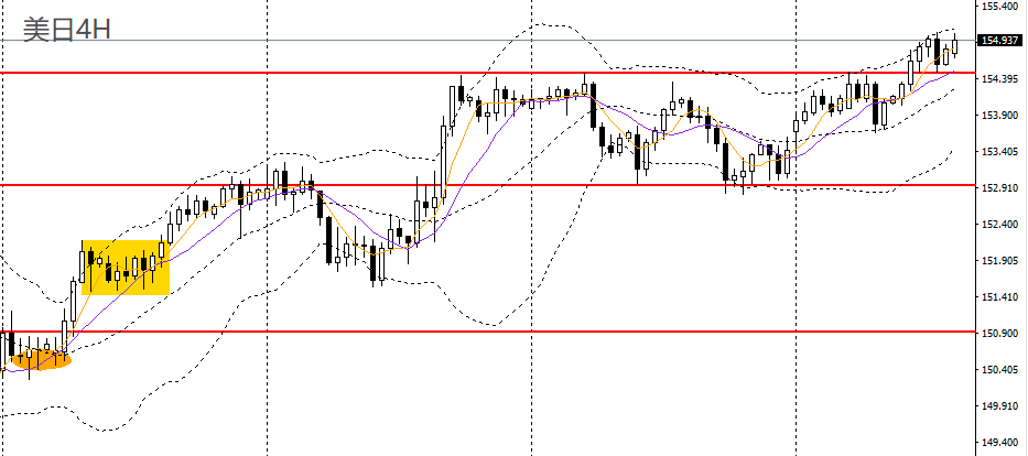 美日周三延续上行,创下9个月以来新高,4小时站上关键平台阻力154.40一线,短线趋势彻底转强,多单可继续持有,如升破155,可继续上看至155.40。