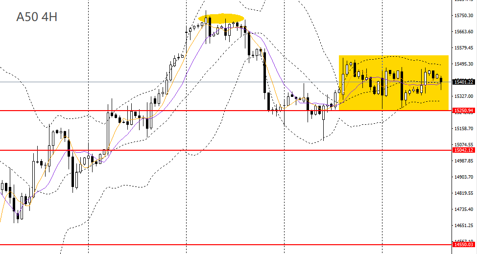 A50小幅反弹,短线走势仍趋于震荡,4小时多次上探15500附近阻力,如无法升破,多单可暂时离场,如进一步升破,可上看至15700。