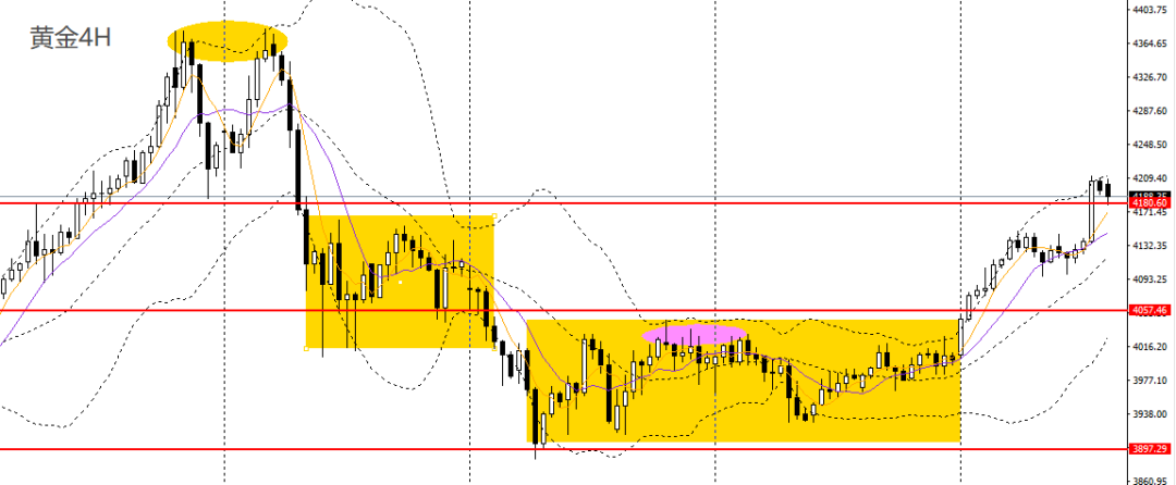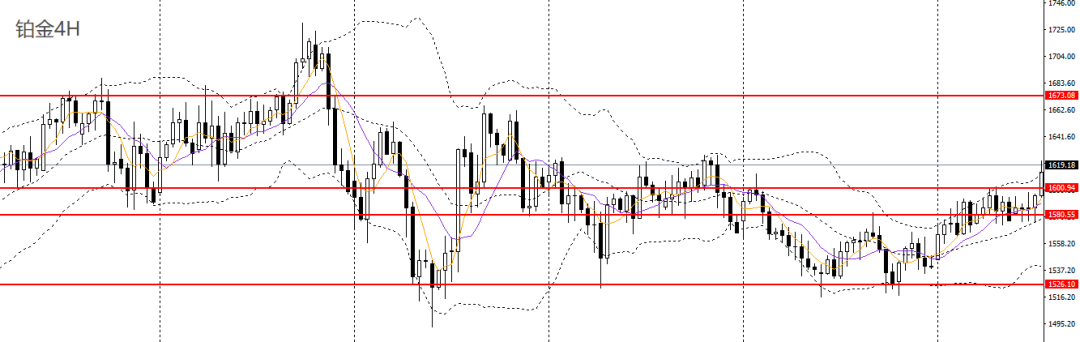 铂金收长阳柱 4小时站上1580-1600压力带,短线趋势进一步转强,多单仍可持有,后市可看多至1630,1660。