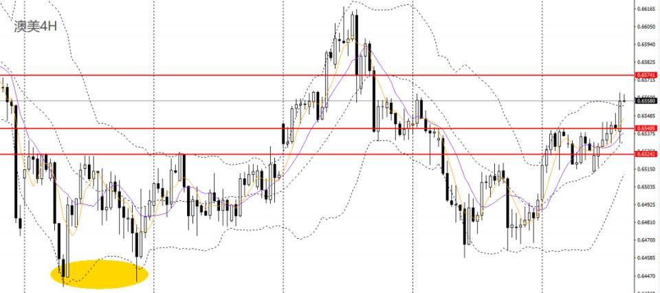 澳美日线呈多方炮,日线RSI站上50,4小时上破0.6540一线压力,多单可继续持有,后市大概率将上探0.6570,0.66-0.6620。