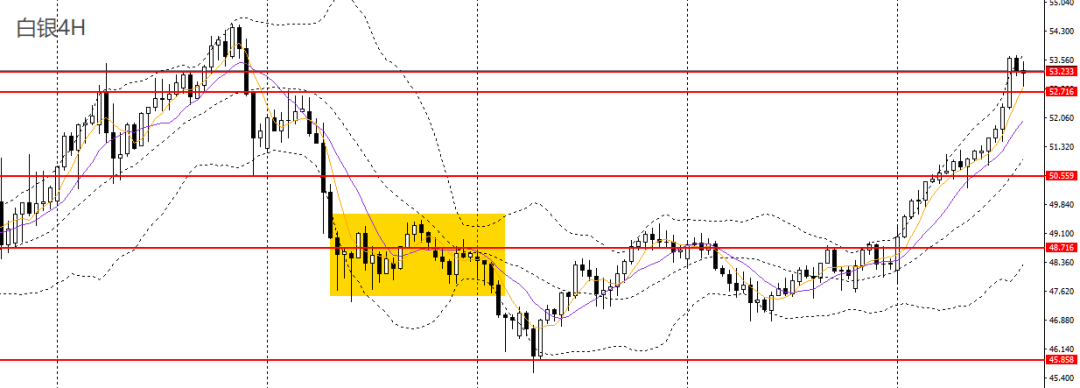 白银强势拉涨,触及日线布林上轨,日线RSI到达高位,4小时上破52.70一线阻力,上行空间打开,52.70上方可维持低多思路,如继续站上53.60,可上看至日线前高。