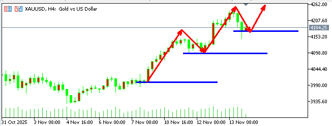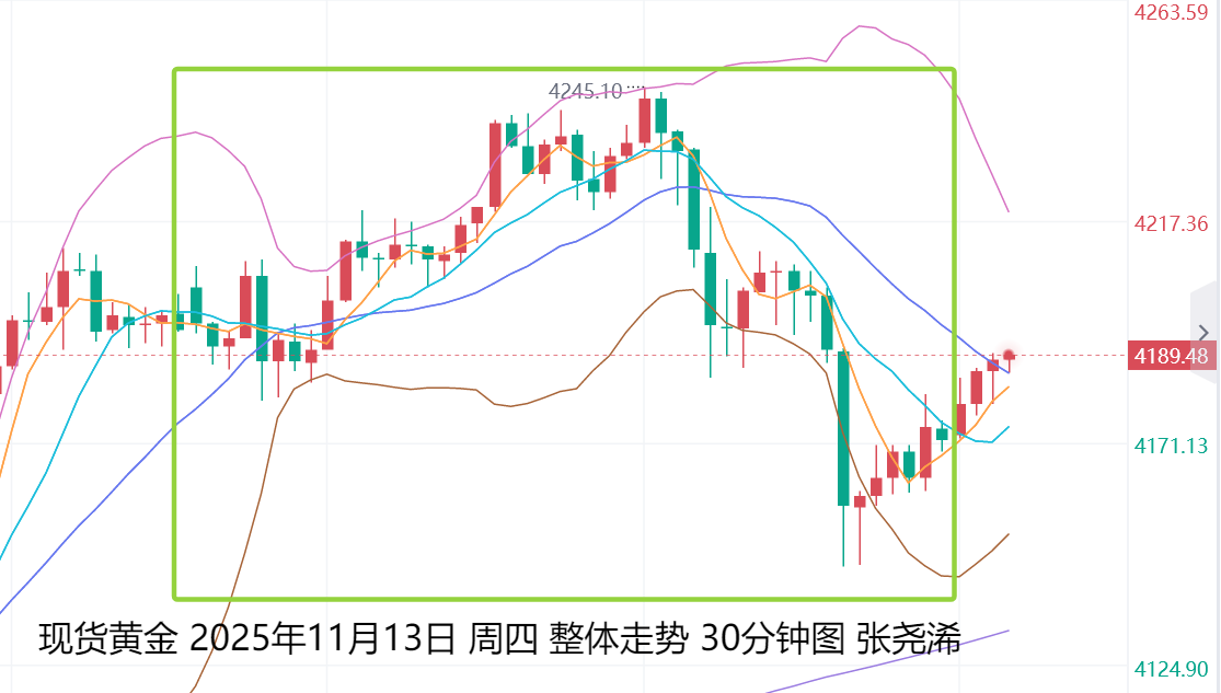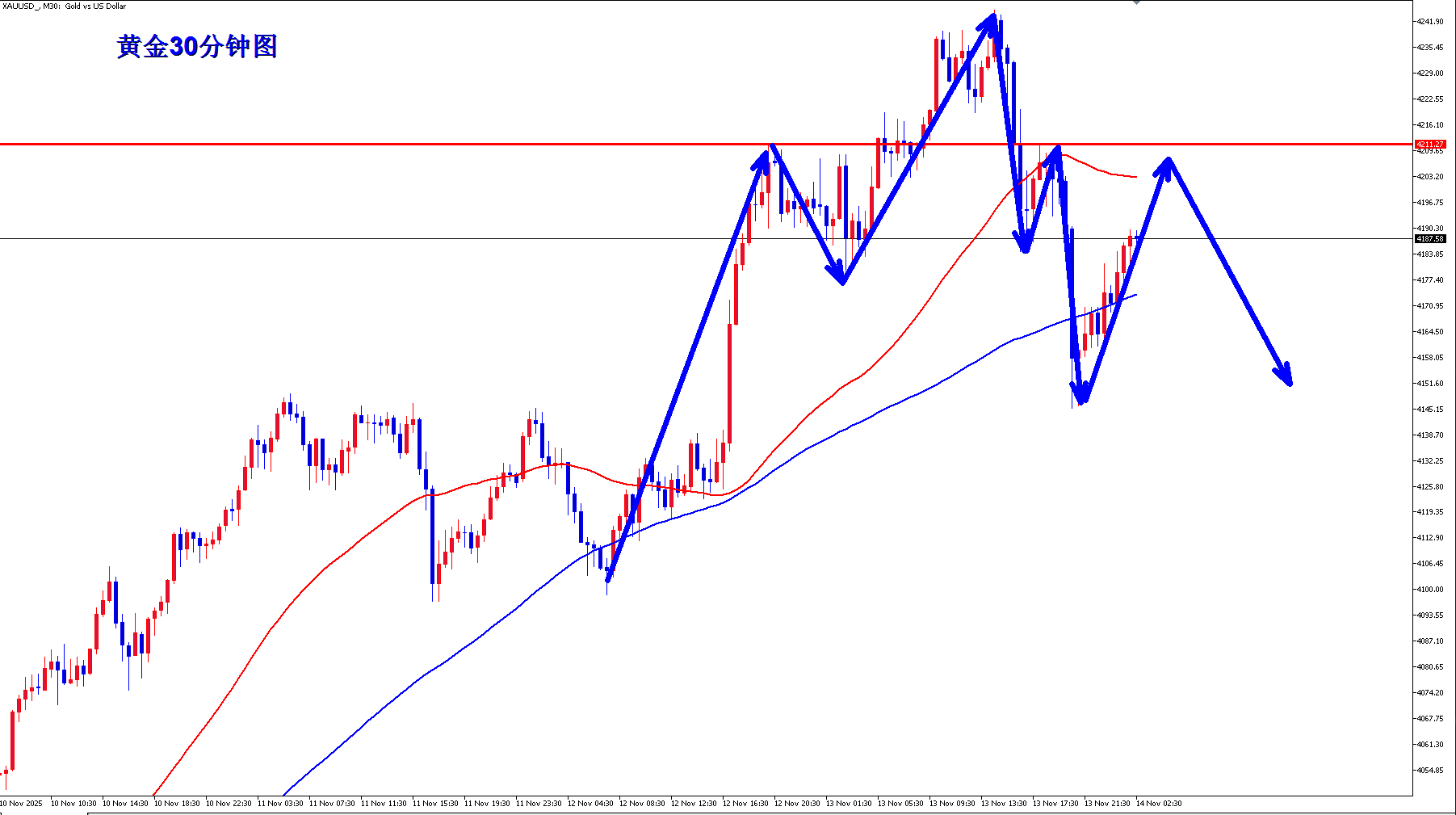 金价在隔夜美盘的下跌原因来自美国政府重开后的市场反应,一波抛售将价格从4240一线推低了50美金,今天(11月15日)行情自4175一线反弹,目前价格再次来到4190附近震荡,上方压力位参考昨日支撑4211。