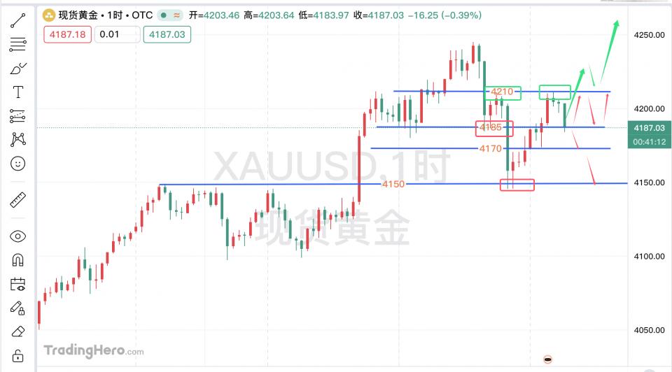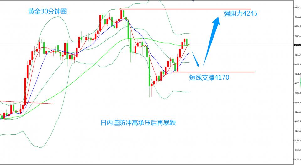 昨日金价刚开始延续了前两天的强势,开盘开启反弹走高,盘中多次冲击4240-44一线未果,随后美盘时段开启震荡走低,并且在凌晨时段一度回吐日内全部涨幅,最低触及4145后开启反弹,相对于日内高点回撤近100个点。不过需要注意的是,金价凌晨触及45-50关键支撑位后开启震荡走高,并且在今日早间从70附近直接开启拉升,目前已经再次突破4200关键节点。昨日大幅调整接近尾声,今日主要还是以低多思路为主。