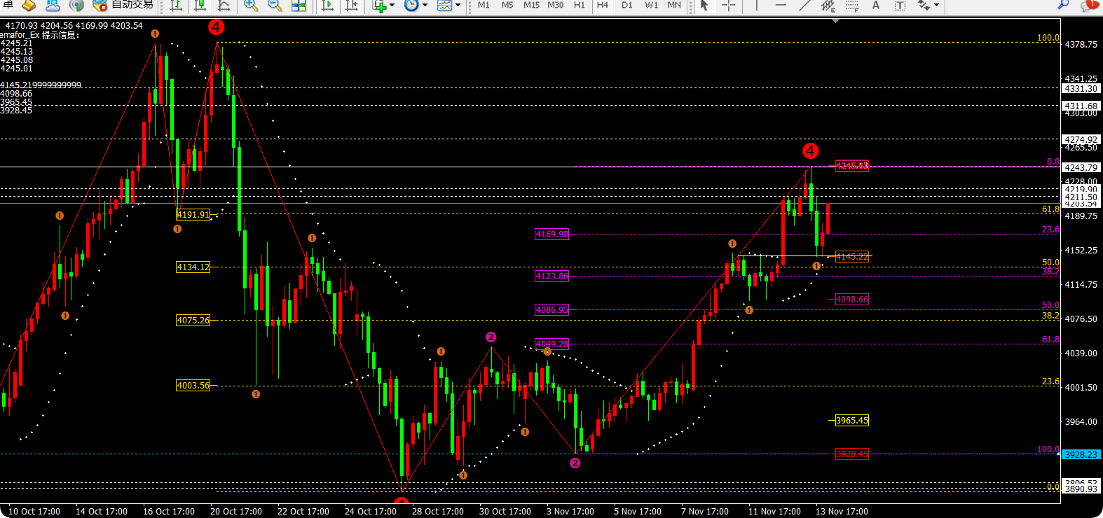 昨日走势基本符合预期价格冲高4245附近后回撤起涨点4145一线;我们的高位4242-44空完美收获,同时我们低位4146-48多也是完美拉升。