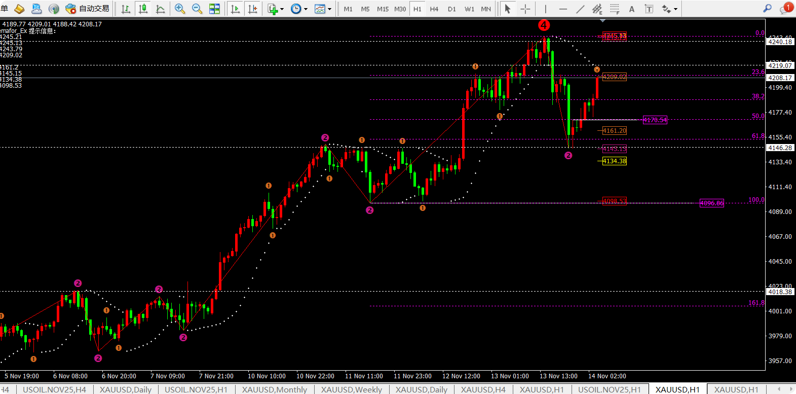 因为昨日反弹4170后维持4170-60区间震荡后拉升;早间价格从4170上涨后回撤4174再次上涨;所以目前在4170附近再去参与多单肯定是没有机会的。而4180就目前而言也是没机会,只能等11点4小时收线。