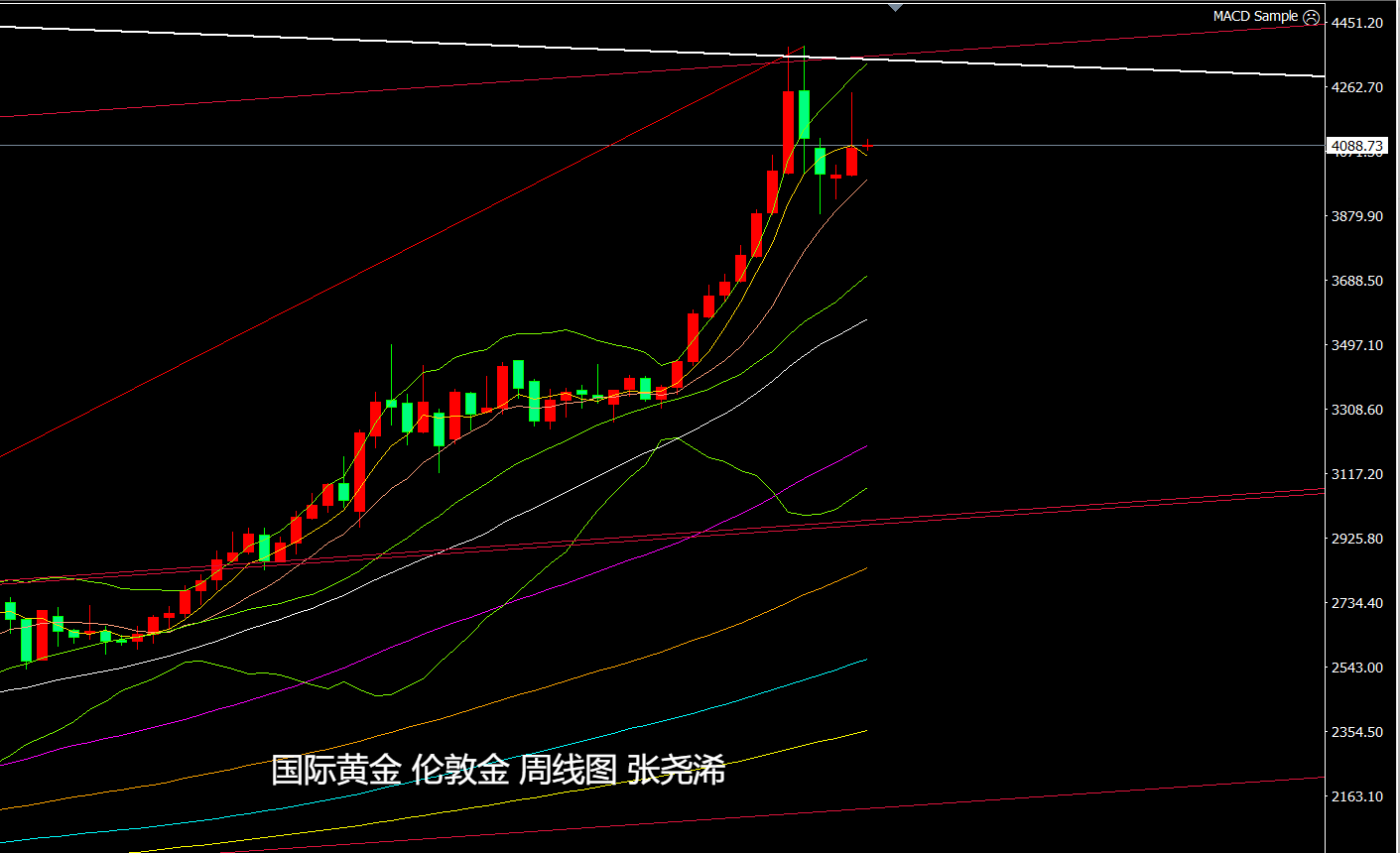 具体走势上,金价自周初开于4001.37美元/盎司,直接先行录得当周低点3997.70美元,随后则反弹走强拉升突破中轨阻力,但在周四录得当周高点4245.07美元,已经遇阻趋势线压力附近后,回落走低,并在周五加大走低力度,一度跌至中轨等支撑下方,最终动力有所减缓,收于4080.31美元,周振幅247.37美元,收涨78.94美元,涨幅1.97%。