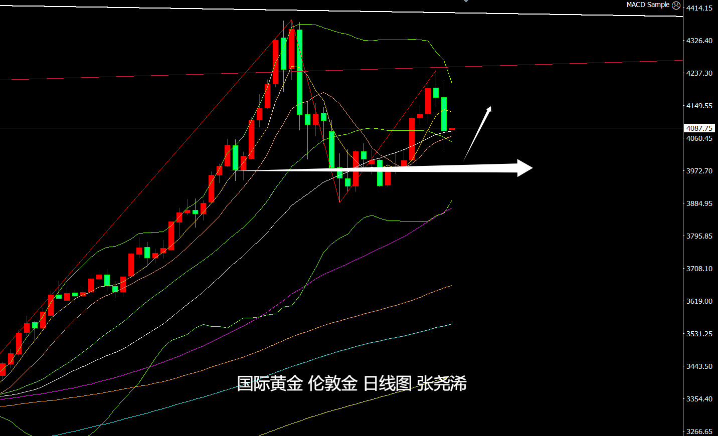 技术上,周线级别,金价上周冲高回落倒垂收线,但仍未跌至10周均线下方,而仍具有看涨前景,本周先行关注5/10周均线进行看涨反弹,如进一步走低,下方关注之前多次触底反弹攀升的中轨线及30周等均线支撑位置,也是继续入场看涨的机会。仍可等待再度触及4300美元或新高。