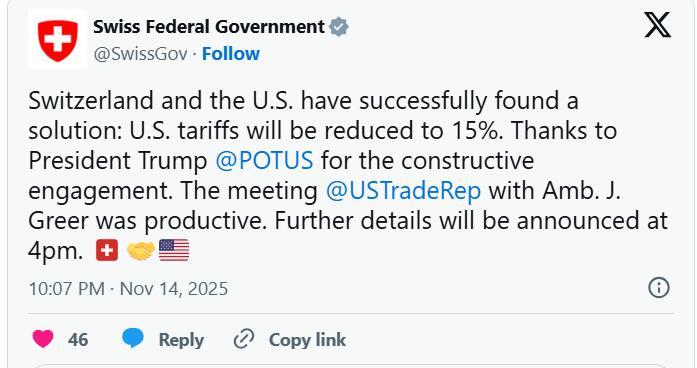另一方面,当地时间11月14日,美国白宫公布川总签署的最新行政令,进一步调整“对等guanshui”的适用范围,将部分农业产品排除在此前依据《对等guanshui行政令》所征收的附加guanshui之外。同日,瑞士政府在社交媒体上宣布,美国对瑞士实行的guanshui将降至与欧盟相同的15%。受到利好消息冲击,瑞郎大幅升值,美元兑瑞郎失守大半个月以来新低,但美盘迅速收复失地,利好基本出尽。黄金则遭受深度打压,日内跳水近200美金。
