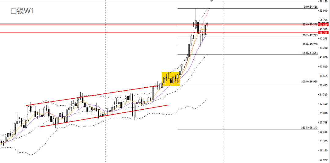 白银上周逼平前高,RSI接近超买区,波段有望继续破高。周五延续跳水,失守5日均线,51.50附近面临强压,如无法升破可继续做空,下方首先关注50.50一线支撑。