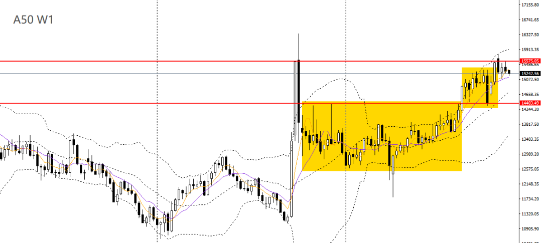 A50上周微幅收跌,RSI小幅回落,波段走势整体偏强,大概率将维持震荡上行。周五大幅走低,4小时多次承压于15500,且刺破15200一线支撑,有望下探15000关口,如彻底下破,可继续下看至14800。