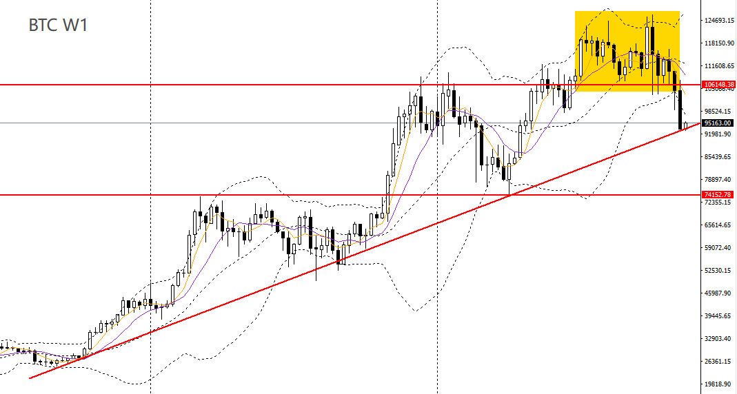 比特币周线呈三只乌鸦,回踩上行趋势线,波段多头动能进一步放缓,不排除将延续回落。昨日继续跌破近期新低,承压于5日均线,日线RSI到达低位,96000为上方第一强压,如无法升破,短线预计将继续下探88000-90000。