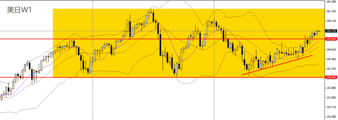 美日上周沿5周均线继续走高,RSI上扬,波段仍处于大区间震荡走势。周五走了一波过山车,刺破10日均线,4小时下探关键支撑153.60,短线方向仍不明朗,稳健者可保持观望。