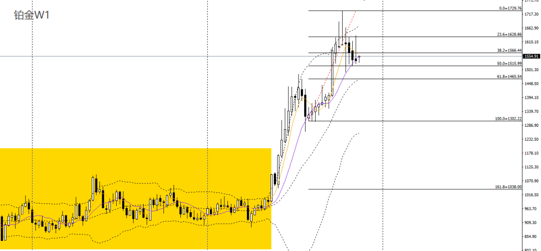 铂金上周冲高回落,围绕5周、10周均线震荡,RSI小幅回落,波段多头动能减弱,预计将延续高位震荡。周五收长阴柱,日线RSI跌破50,4小时呈头肩顶,1580下方可维持高空思路,如彻底失守1530,可继续看空至1500。
