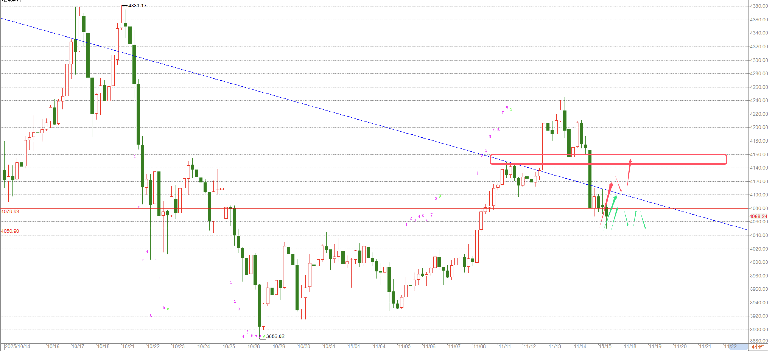 接下来可能会出现,回撤到这波上涨的起始点,也就是停摆开始的位置3850附近。