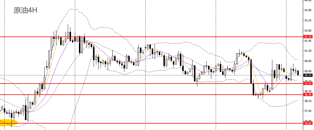 美原油昨日延续上行,上探10日均线,4小时多次触及60.50-60.70一带阻力,如无法有效上破,多单建议离场,稳健者可保持观望。