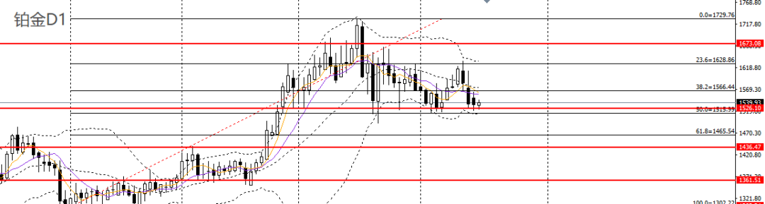 铂金周一小幅阴跌,承压于10日均线,4小时于1530一线支撑企稳,如继续守稳,空单可暂时离场,如继续下破,可下看至1500。