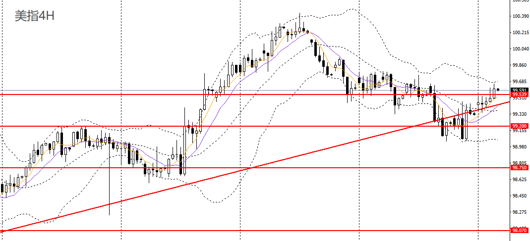 美元指数收小阳线,回踩日线上行趋势线,4小时站上关键压力99.50,短线走势偏强,有望进一步上探99.70,100。
