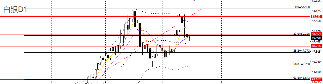 白银收十字阴线,下破10日均线,4小时刺破50关口,下破三角震荡区间下沿,且回踩关键支撑49.50,短线走势仍偏弱,50.20附近承压可继续进空。