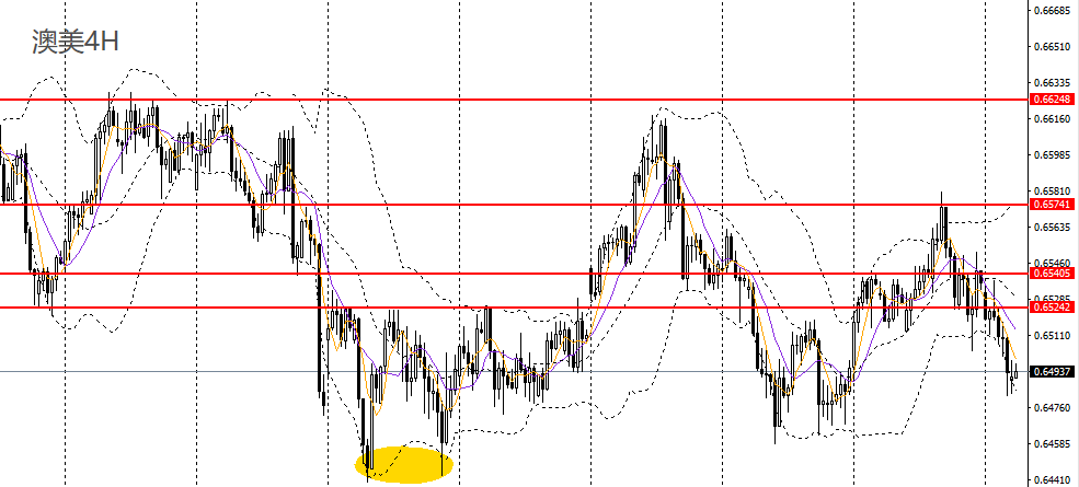 澳美大幅收跌,日线RSI下破50,4小时失守0.65关口,短线处于震荡偏弱格局,但空单建议谨慎持有,如于0.6460-0.6480一带企稳,空单可暂时离场。