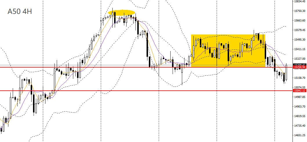 A50持续回落,逼近关键支撑15000关口,日线RSI跌至50附近,但日线级别整体走势仍偏震荡,如维稳于15000之上,空单建议暂时了结。