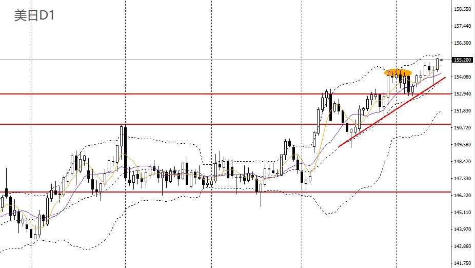 美日继续升破近期新高,日线RSI到达高位,155为下方第一关键支撑,如维稳于上方可延续低多思路,后市有望进一步挑战155.80-156。