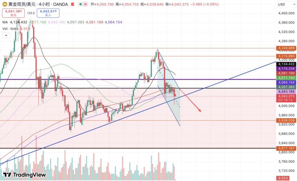 一如我们昨晚的预期(下图1),黄金没能守稳4080后快速下单,最终的4050支撑也被刺破,今天行情自该低点附近反弹,但上方的均线压力依旧强势,预计短期将在2小时20均线及下行趋势线的4077附近遇阻。而若从1小时级别来看,4066附近就有压力。