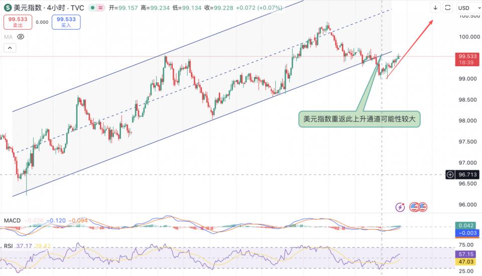 因美联储降息可能停滞,美元指数在最近两个交易日保持回升,从下图中我们可以看到,美指自上周四跌破上升通道区间后,经过这两天的回补,走势正在变得积极,一旦回到上升通道(下图),将对金价造成更严重的打击,从4小时线的指标情况看,这种可能性并不低。