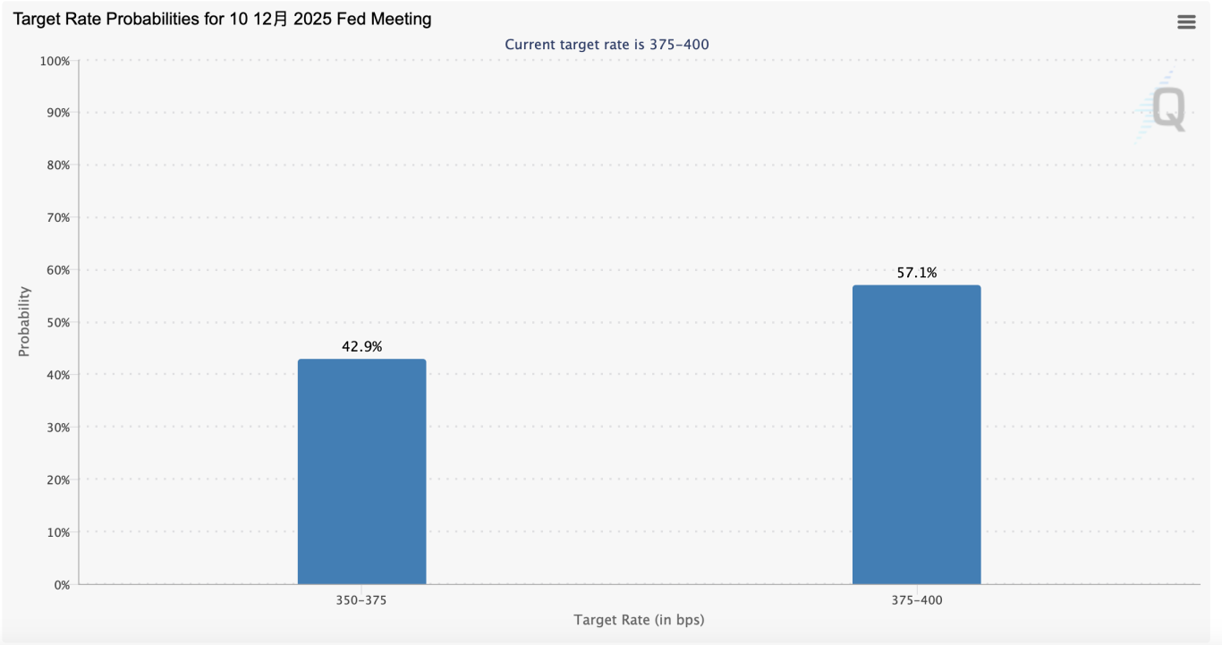 芝商所(CME)的 FedWatch 工具显示(下图),交易员目前认为 12 月降息 25 个基点的可能性为 42.9%,低于上周的 60%。