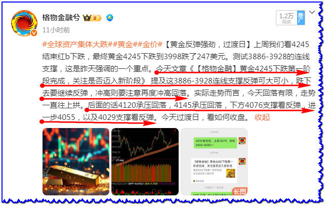 所以,昨天文章《【格物金融】黄金4245下跌第一阶段完成,关注是否迈入新阶段》我们提及这个反弹可大可小,但是,冲高的话都要考虑冲高回落,要做好反复试探的准备,昨晚短评《【黄金反弹强劲,过渡日】》强调回踩4055支撑的话考虑反弹,最终最晚4056附近上涨到今天早上最高到4110美元。我们继续看图,如果行情是强势的话,其实,4384的红色abc调整可以在3998结束。但是呢,鉴于月线上之前35T平衡关系,我们还是倾向于红c继续向下拓展,成立的前提就是把3886-3928的连线破掉,把3998破掉才能成立。所以,今天的话依然是高空为主,4111下方下跌,然后进一步昨天高点4133承压下跌,进一步4180承压下跌,下方的话,由于昨晚4055已经反弹过一次了,那基本就是4040不破多一次,进一步4028不破多一次,最重要的话,自然是起点3997.9这个位置,这个位置没破之前无条件多一次,如果这个位置跌破的话,c浪就拓展下跌了。